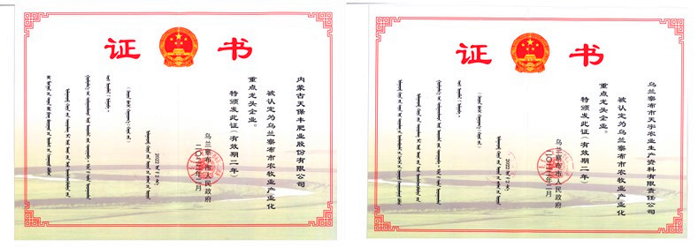 On June 16th, Mr. Xiang Yu, director of Agriculture, Animal Husbandry and Water Conservancy Bureau of Jining District, Wulanchabu City, led some leaders to visit our company, and personally sent the plaque and certificate of key leading enterprise of agriculture and animal husbandry industrialization to our company. Congratulations to InnerMongolia Tianbaofeng Fertilizer Co.,Ltd. and Wulanchabu Tianyu AgricultureMeans&Production Co.,Ltd. both of which are subordinate to our group, for being recognized as "Key leading enterprises of Agriculture and Animal Husbandry Industrialization in Ulanchabu City".