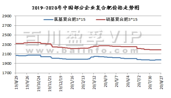 本周(2020.8.21-2020.8.27)国内磷酸二铵市场产销两旺,本周二湖北货源正式官宣调涨价格:64%二铵出厂价整体调涨至2250-2280元/吨,高端报价出厂2350元/吨,实际新单出厂成交价2200-2250元/吨;西南货源64%二铵主流出厂报价2200-2250元/吨以上,实际新单成交2180-2200元/吨左右。华北地区64%二铵主流第一到站价2500元/吨。由于今年二铵同比价格偏低,受国内外需求拉动,实际成交价格逐步回归正常水平。
