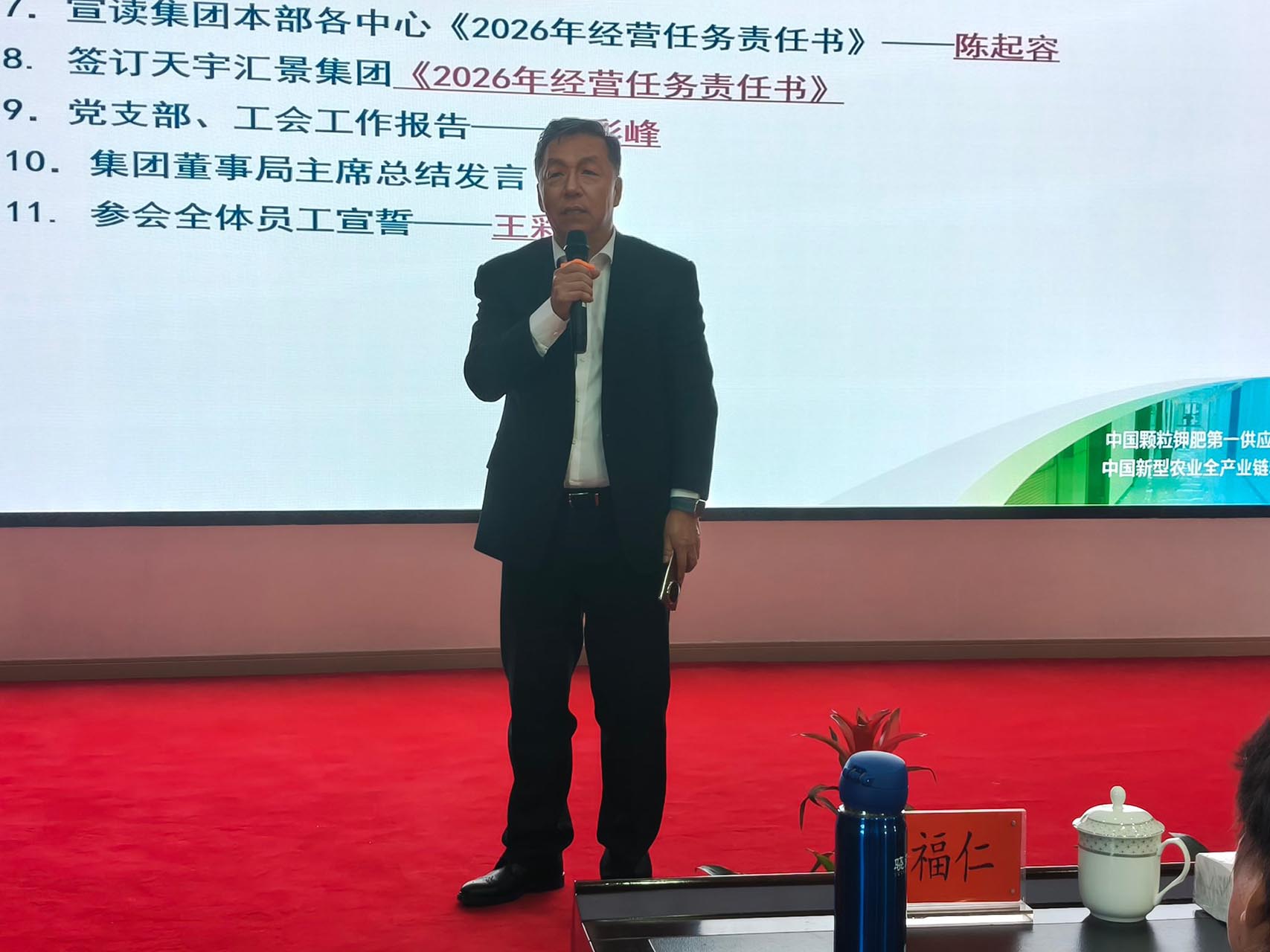 会议由集团秘书长主持,会上向全体员工宣布了新一届董事会、监事会、经营班子成员,宣读了《2025年工作完成情况及2026年工作安排》《2026年营销薪酬及激励办法》等多项内容;会议最后,集团董事局主席总结了一年来我集团经历的风雨与成长,在全体员工齐心协力下攻克了一个又一个难关,顺利平稳度过危机与挑战并存的2025年,代表公司股东和董事对受到表彰的人员表示祝贺和感谢,并对全体员工一年的付出表达衷心的感谢。